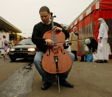 The thought of a classical cellist at a sit-in protest might seem surprising, but not to Haimovitz. For one thing, playing in less-formal settings has been a distinguishing aspect of his career. A brief sampling of Haimovitz’s projects during the past decade or so: the 2000 Bach “Listening Room” tour of the solo cello suites, rather than happening in traditional concert hall setting, took him into clubs throughout the U.S., Canada, and the U.K. In 2002, he was the first classical artist to play at CBGB—the New York punk club that was once home to performers like the Ramones, Blondie, and Patti Smith. His most recent recording, shuffle.play.listen, made with pianist Christopher O’Riley, features one CD of new arrangements of works by Stravinsky, Janácek, Martinu, Piazzolla, and Herrmann; the second CD features new versions of songs by Blond Redhead, the Cocteau Twins, and Radiohead, as well as Arcade Fire’s “Empty Room” and John McLaughlin’s “Dance of Maya” and “Lotus on an Irish Spring.”